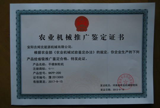 經過全體吉姆(mǔ)克人的努力,我公司9KPP-90型、9KPP-120型、9KPP-200型(分別為原ZLSP-120、ZLSP-150、ZLSP-200)3個型號製粒機(jī)通過河(hé)南省農業機械管理局審核評定,獲得省級推廣鑒定資格,並(bìng)列入《2012—2014年河南省支持推廣的農業機械產(chǎn)品目錄(lù)》(2014調整(zhěng)稿),並於2014年(nián)1月8日在河南農機網上進行了公示。